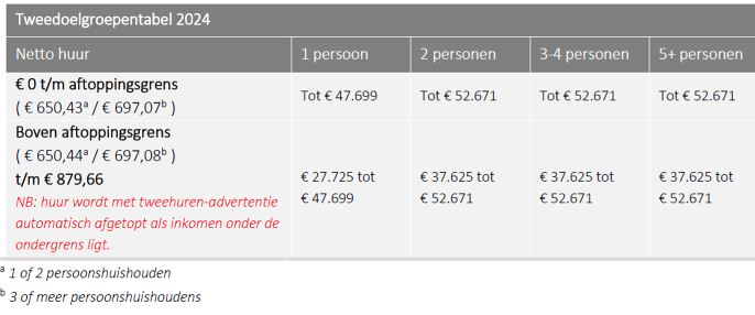 Meer informatie over met welk inkomen u welke huur betaalt, vindt u in de tabel tweedoelgroepenbeleid (zie bijlage).
